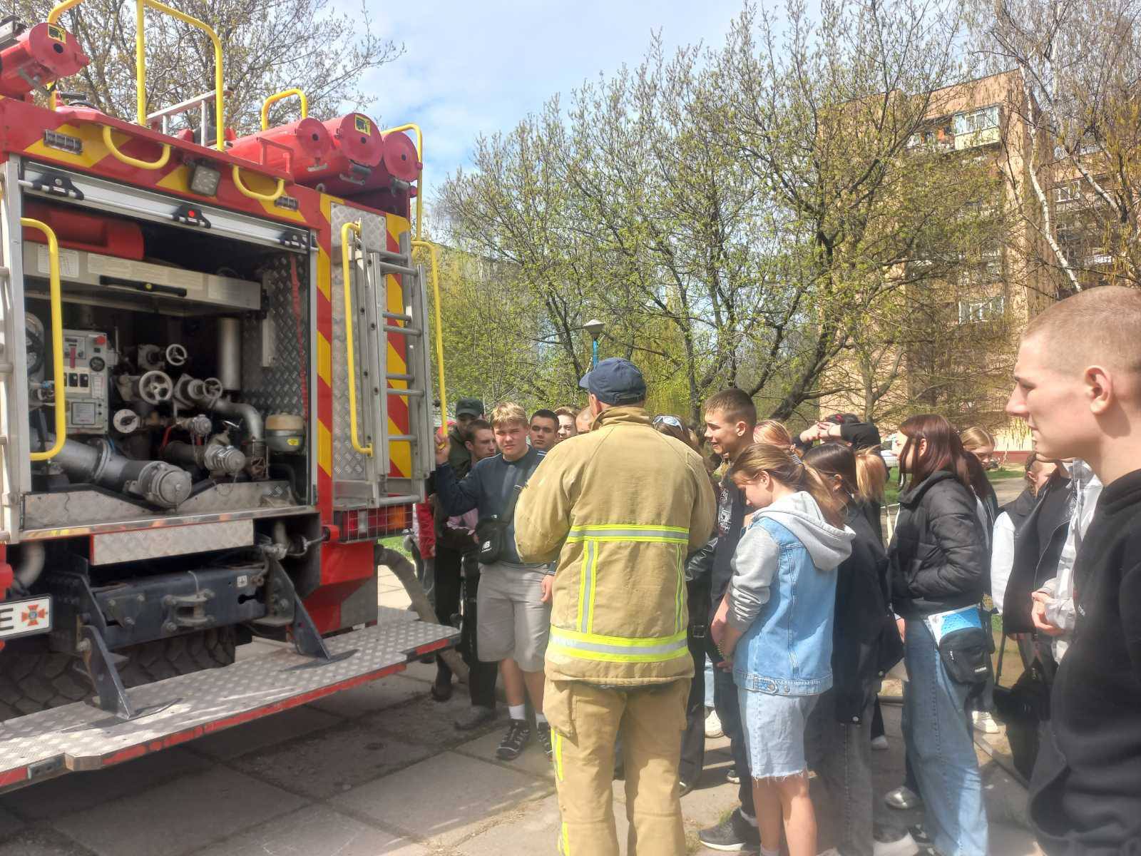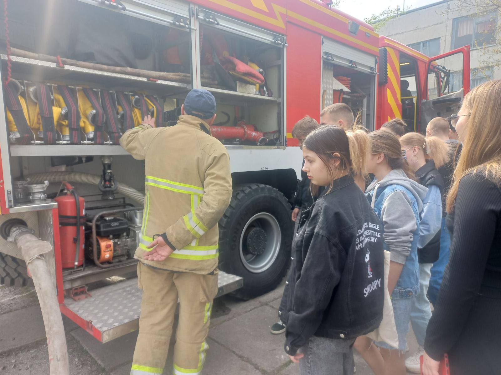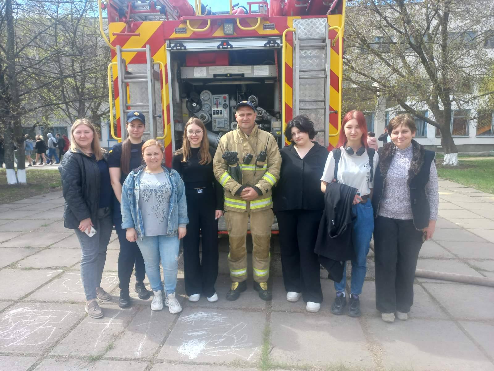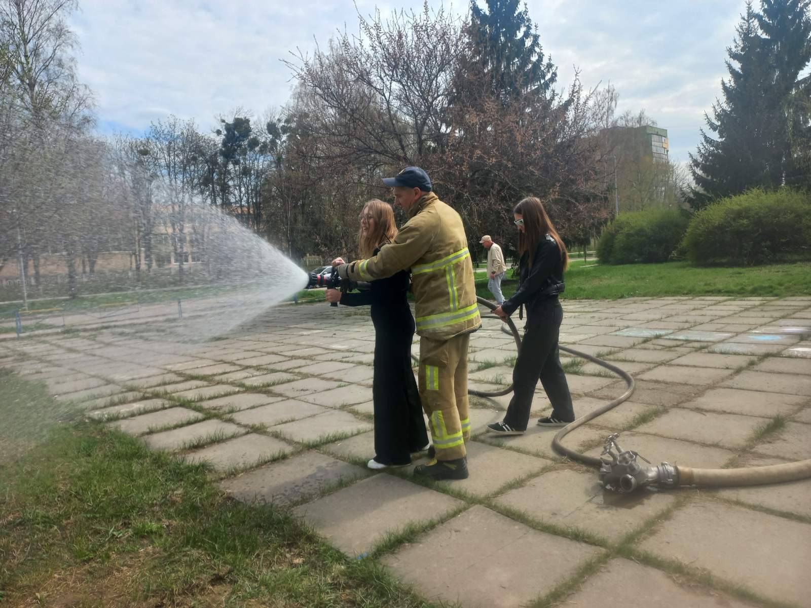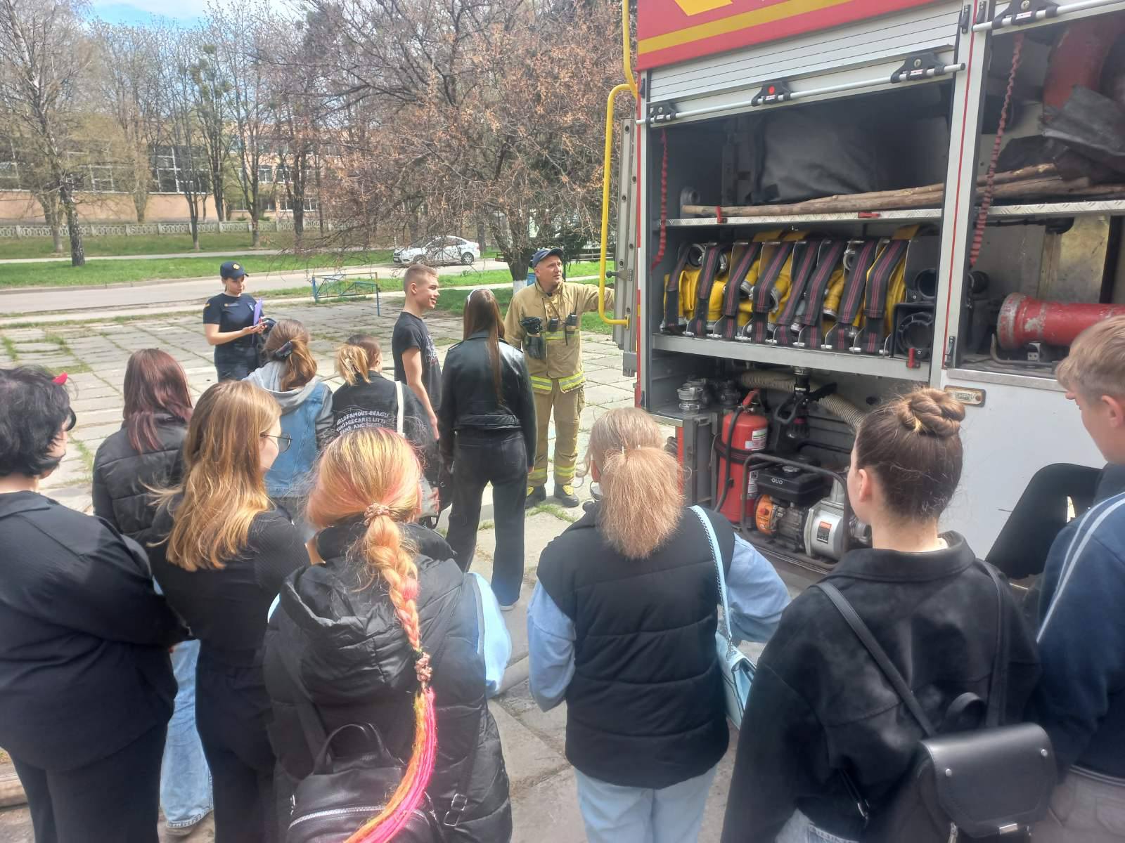 Після завершення розповіді здобувачі освіти ознайомилися з влаштуванням пожежної машини та мали змогу спробувати самостійно повправлятися у гасінні пожеж.