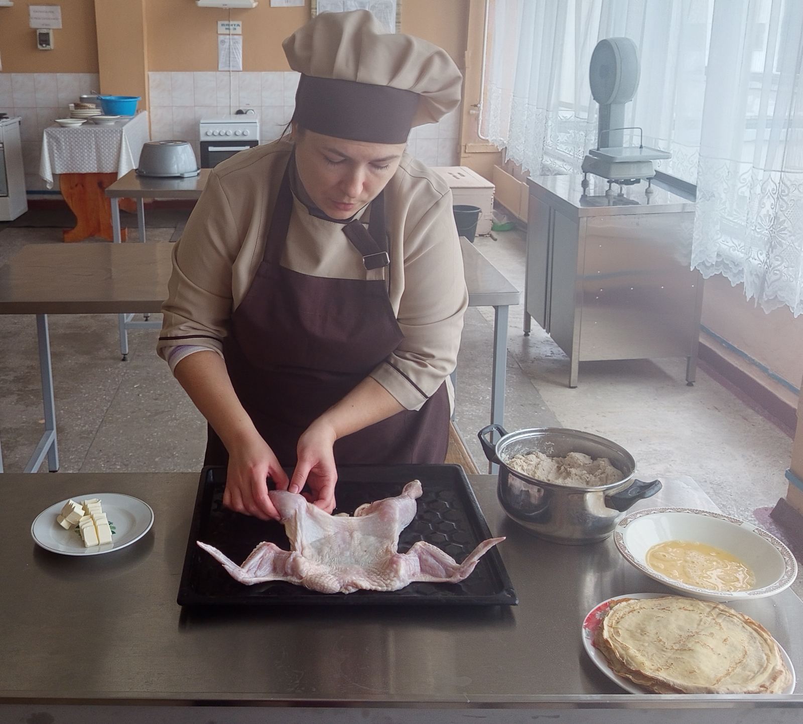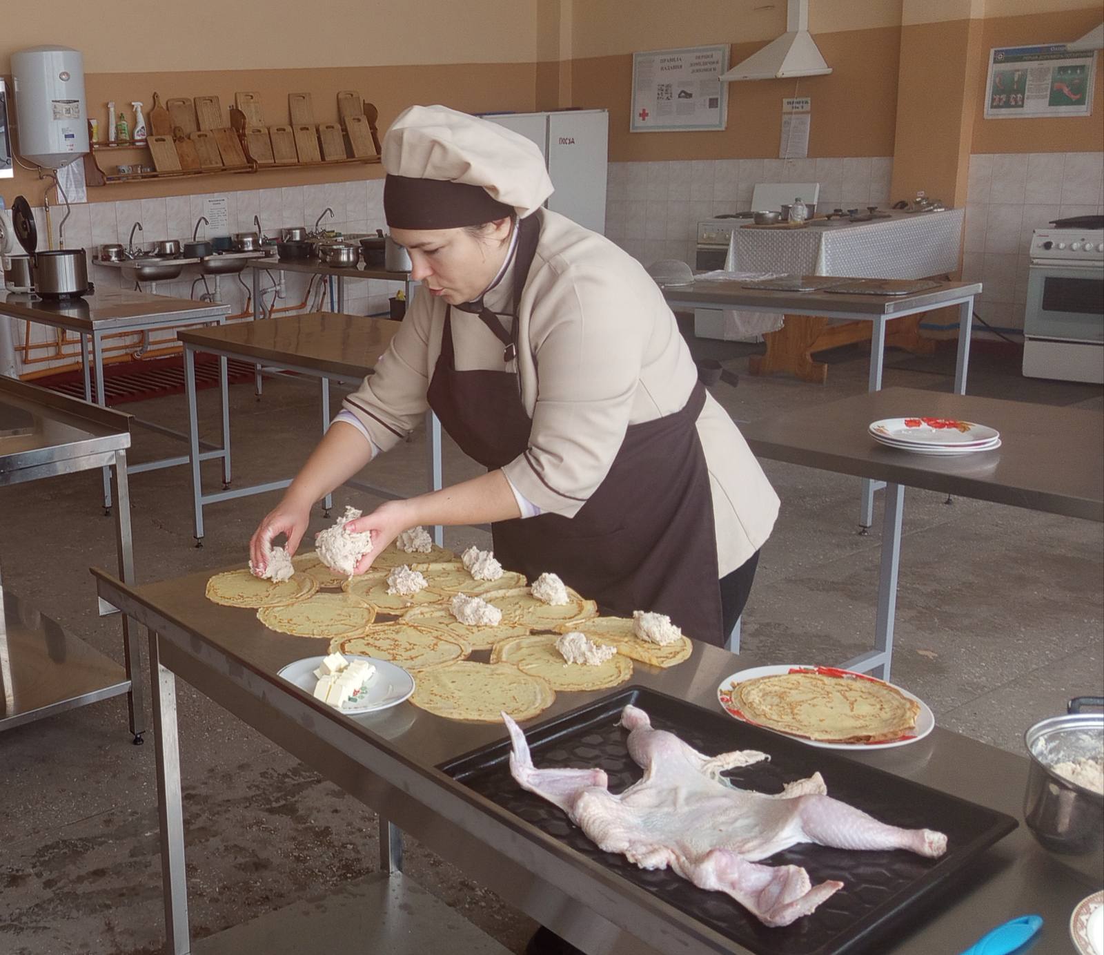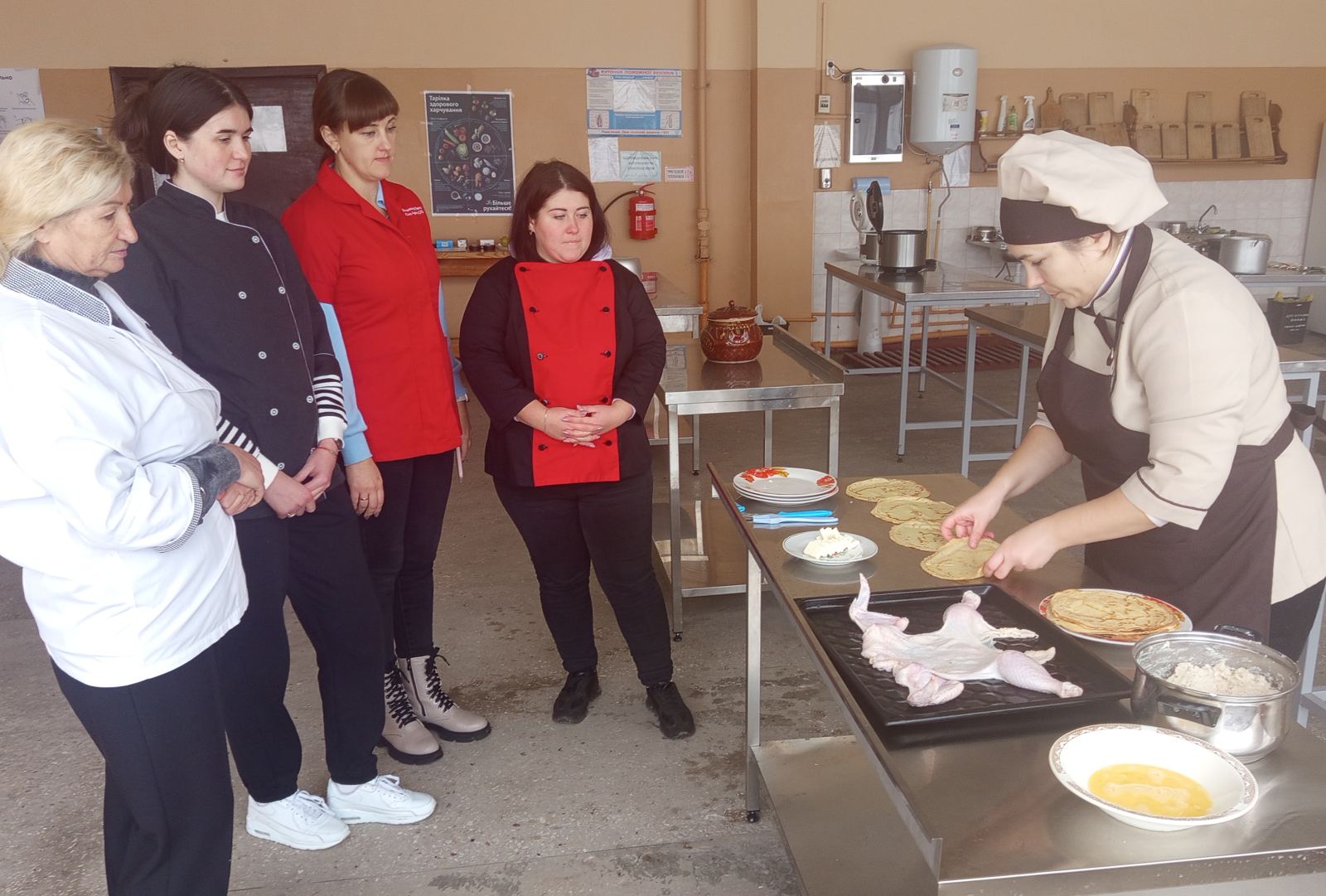 Вона ж провела майстер-клас «Приготування курки фаршированої млинцями» для колег, демонструючи справжній клас.