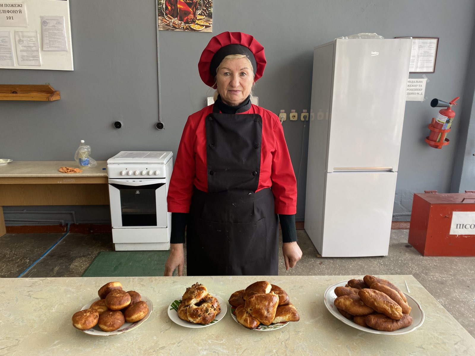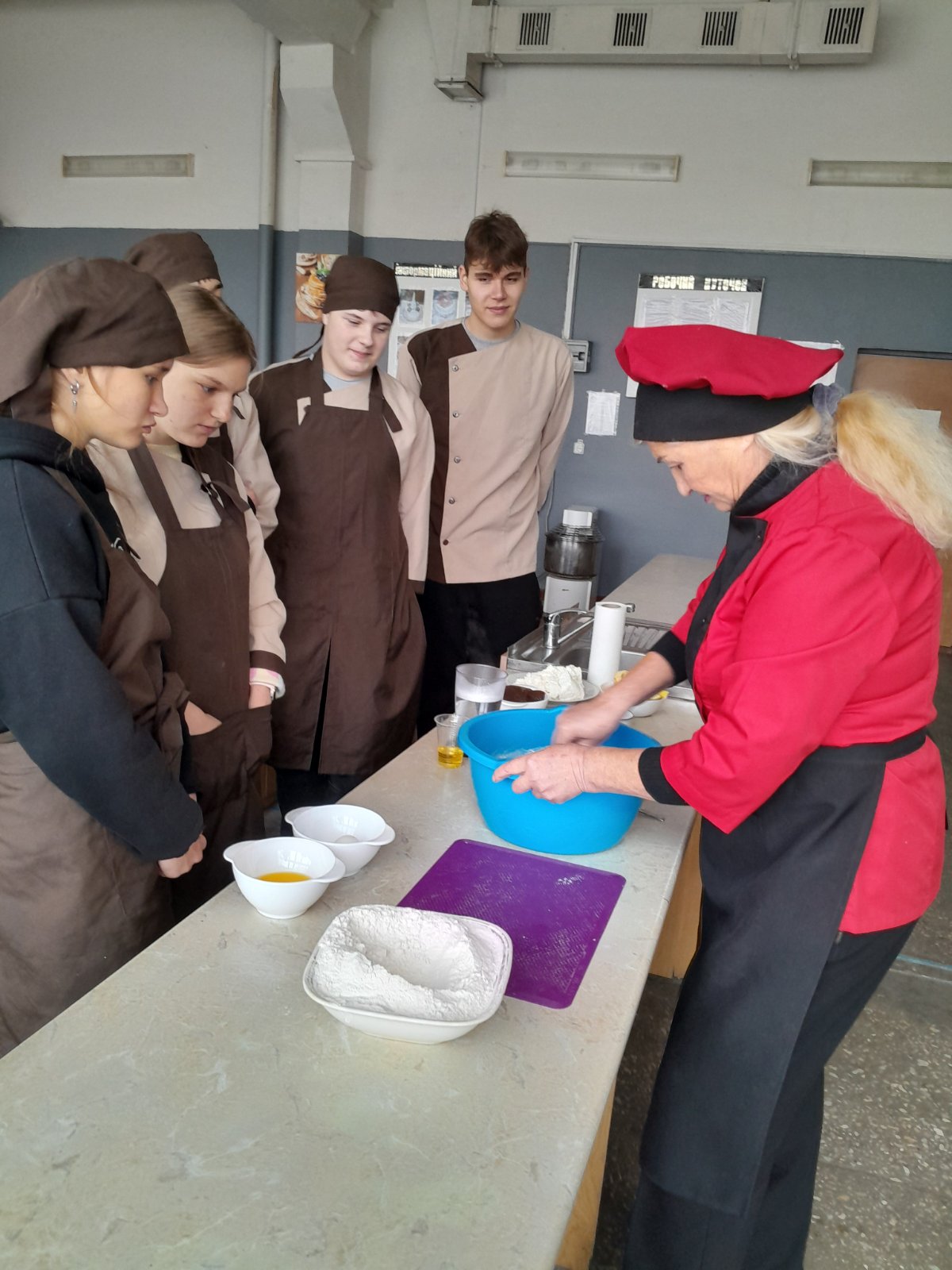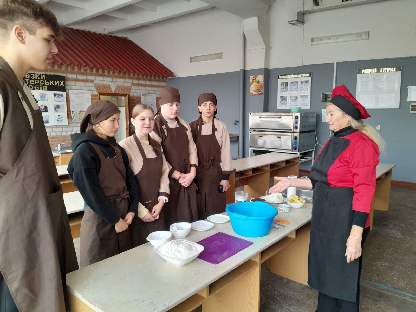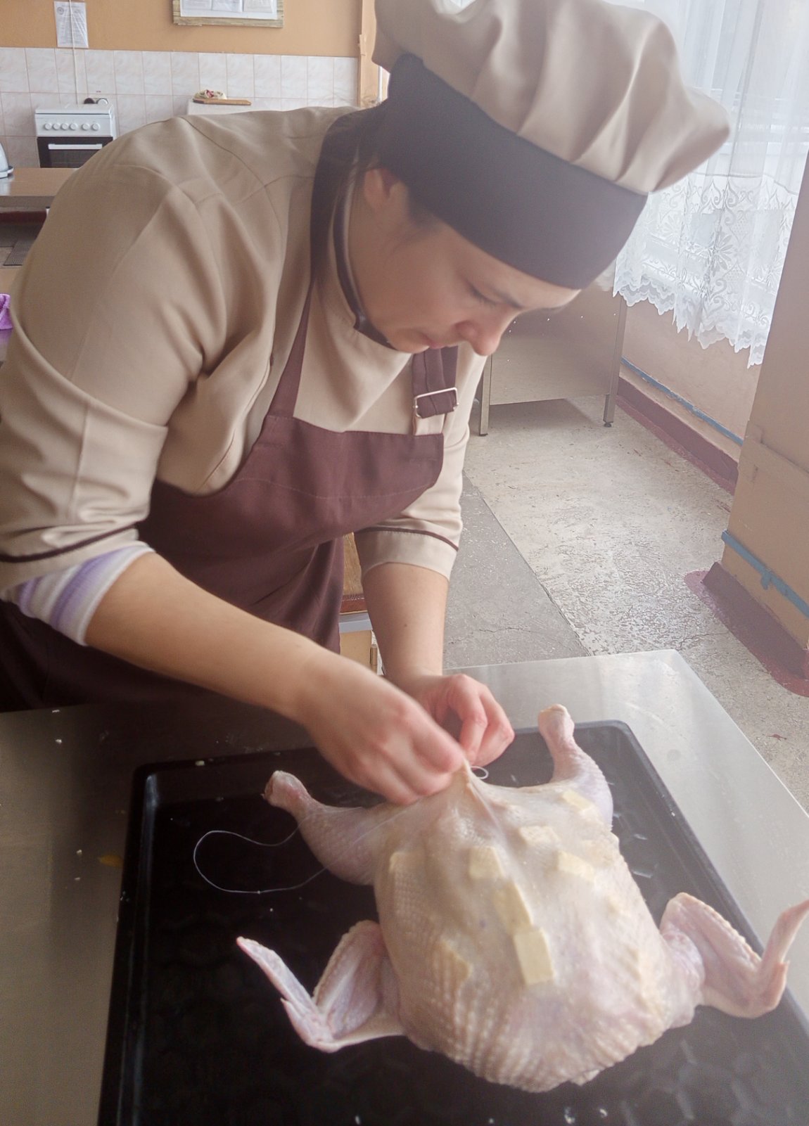Вона ж провела майстер-клас «Приготування курки фаршированої млинцями» для колег, демонструючи справжній клас.