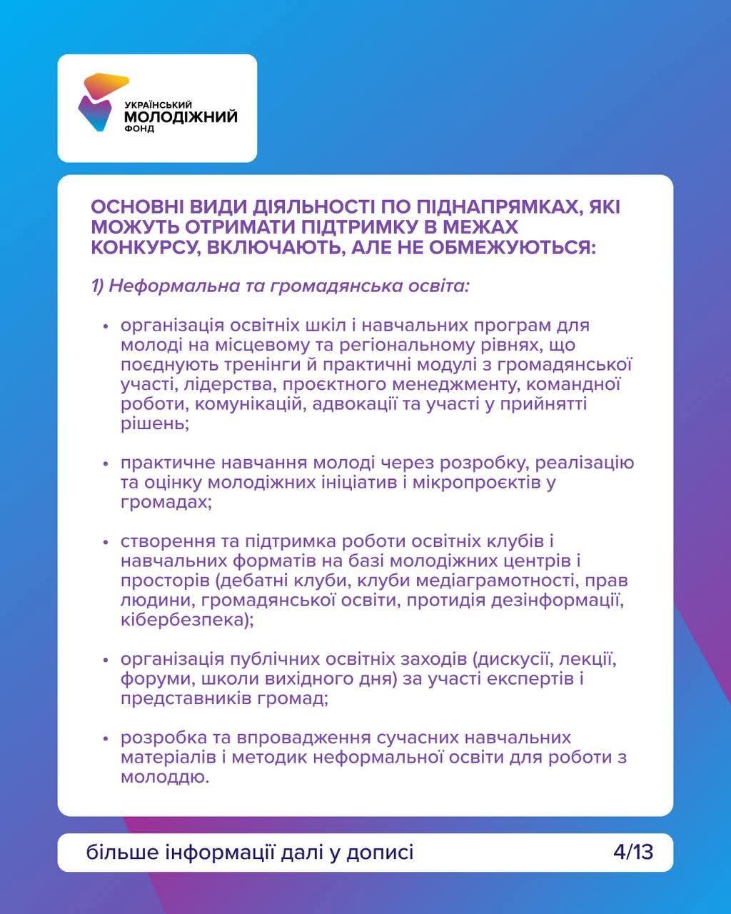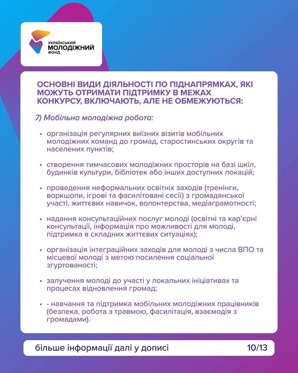 громадянська та неформальна освіта, волонтерство, молодіжні обміни, ініціативи для відновлення громад, підтримка молоді після повернення з-за кордону, розвиток молодіжних просторів, мобільна молодіжна робота, підвищення кваліфікації молодіжних працівників.