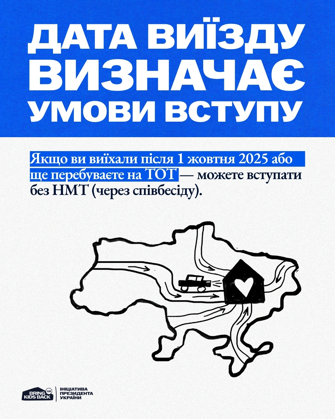 Якщо ви досі перебуваєте на ТОТ або виїхали після 1 жовтня 2025 року — вступ можливий без НМТ, через співбесіду в університеті. Якщо виїзд був раніше — потрібні результати НМТ, але діє квота-2.
